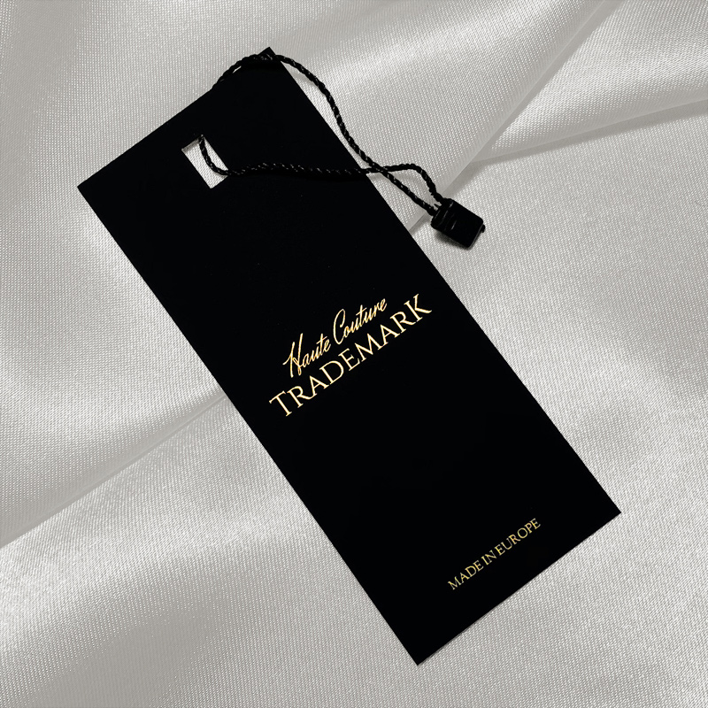 Crna etiketa sa zlatnim natpisom izrađena od debelog laminiranog kartona Soft Touch, s plastičnim pečatom s uzicom, pogodna za razne odjevne proizvode. Ova vrsta visećih oznaka izrađena je od visokokvalitetnih materijala, uz korištenje najnaprednijih tehnologija u području digitalnog tiska i dorade.