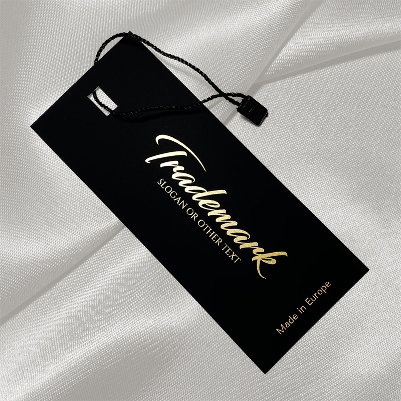 Etiketa sa špagom za viseću odjeću ili druge odjevne proizvode, izrađena od debelog kartona kaširanog Soft Touch folijom sa zlatnim natpisom. Ova vrsta visećih oznaka izrađena je od visokokvalitetnih materijala, uz korištenje najnaprednijih tehnologija u području digitalnog tiska i dorade.