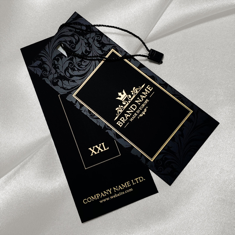 Etikete za odjeću s Premium dizajnom i pečatom s uključenim crnim nizom, izrađene od Soft Touch laminiranog kartona i personaliziranog natpisa zlatnom folijom. Ova vrsta visećih oznaka izrađena je od visokokvalitetnih materijala, uz korištenje najnaprednijih tehnologija u području digitalnog tiska i dorade.
