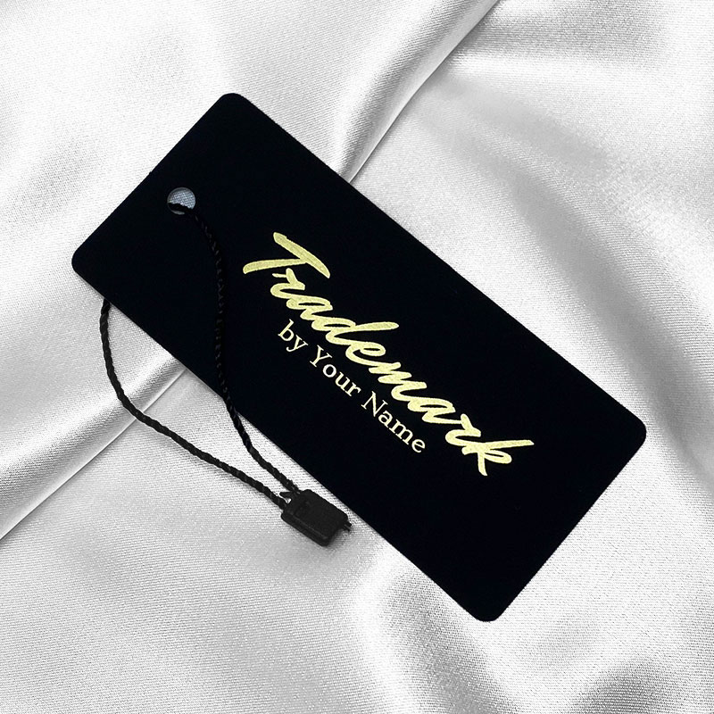 Oznaka za odjeću, izrađena po narudžbi od crnog kartona s tekstom ili logom po narudžbi otisnutim termo transferom sa Zlatnim folijom. Ova vrsta visećih oznaka izrađena je od visokokvalitetnih materijala, uz korištenje najnaprednijih tehnologija u području digitalnog tiska i dorade.