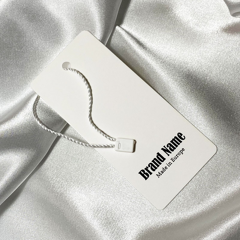 Prilagodljiva viseća oznaka s uzicom za odjeću, obuću, nakit i razne odjevne dodatke, s otisnutim imenom i logotipom marke. Ova vrsta visećih oznaka izrađena je od visokokvalitetnih materijala, uz korištenje najnaprednijih tehnologija u području digitalnog tiska i dorade.