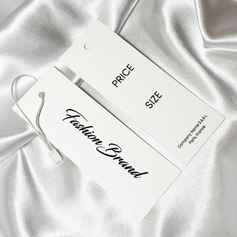 Viseća oznaka proizvoda izrađena od prilagođenog kartona, opremljena bijelom visećom uzicom na odjeći, prilagođena tekstom i logom proizvođača s obje strane. Ova vrsta visećih oznaka izrađena je od visokokvalitetnih materijala, uz korištenje najnaprednijih tehnologija u području digitalnog tiska i dorade.