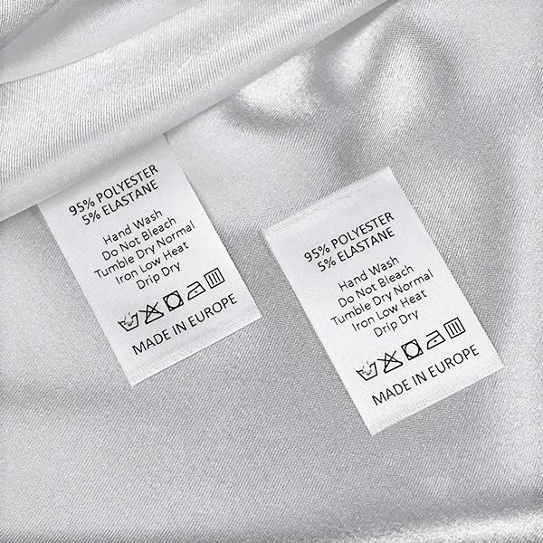 Etiketa za njegu rublja, sa simbolima održavanja i pranja, prilagođena imenom robne marke i sastavom materijala, otisnuta na finom bijelom satenu. Ova vrsta tekstilne etikete izrađena je korištenjem najnaprednijih tehnologija u području digitalnog tiska na tekstilnoj podlozi. etikete se tiskaju na posebnom satenu metodom termalnog transfera, impresivne kvalitete tiska i visoke otpornosti na pranje.