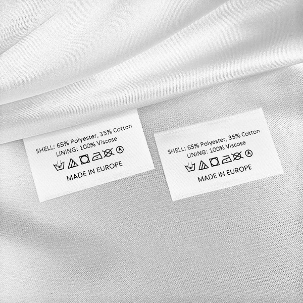 Tekstilna etiketa sa simbolima pranja i njege te informacijama o sastavu materijala, prilagođena finom satenu visoke kvalitete, ultrazvučno vruće rezana. Ova vrsta tekstilne etikete izrađena je korištenjem najnaprednijih tehnologija u području digitalnog tiska na tekstilnoj podlozi. etikete se tiskaju na posebnom satenu metodom termalnog transfera, impresivne kvalitete tiska i visoke otpornosti na pranje.