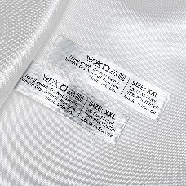 Prilagođena satenska etiketa za označavanje odjeće s informacijama o njezi i održavanju, uključujući simbole pranja, sastav i veličine. Ova vrsta tekstilne etikete izrađena je korištenjem najnaprednijih tehnologija u području digitalnog tiska na tekstilnoj podlozi. etikete se tiskaju na posebnom satenu metodom termalnog transfera, impresivne kvalitete tiska i visoke otpornosti na pranje.