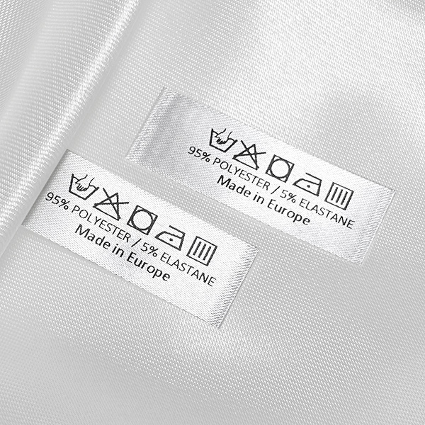 Tekstilna etiketa sa simbolima pranja i održavanja za šivanje na odjeći, personalizirana s detaljima o sastavu materijala i zemlji proizvodnje. Ova vrsta tekstilne etikete izrađena je korištenjem najnaprednijih tehnologija u području digitalnog tiska na tekstilnoj podlozi. etikete se tiskaju na posebnom satenu metodom termalnog transfera, impresivne kvalitete tiska i visoke otpornosti na pranje.