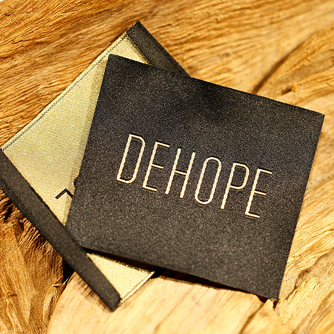 Prilagođena tekstilna etiketa s Digital High Density izvezenim natpisima, pravokutnog oblika i savijenih rubova.